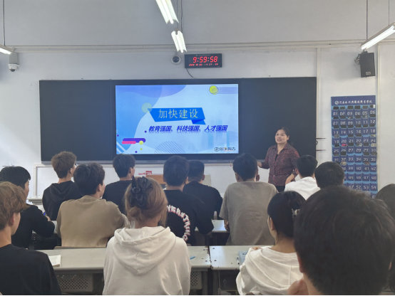10月26日上午,校长李志萍走进思政课堂,以“加快建设教育强国、科技强国、人才强国”为题,为22建电-智设1班的学生上了一堂生动的思政课。