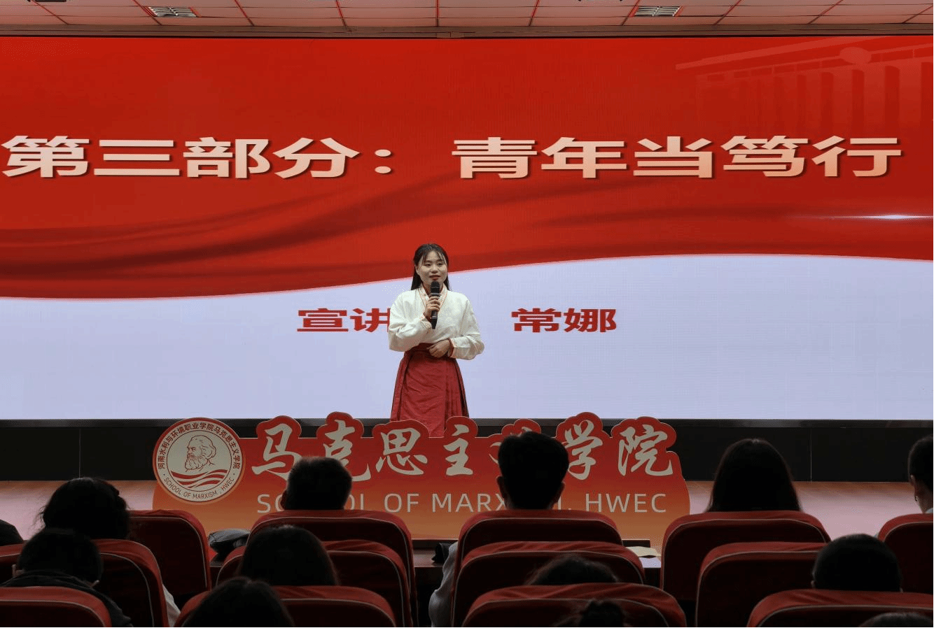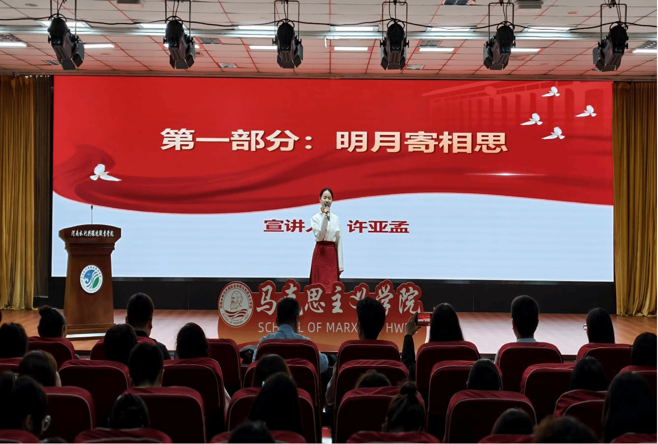 系列活动之一:“家国共团圆”思政宣讲快享会。许亚孟、张玉鑫、常娜三位思政课教师循着“明月寄相思—山河映风骨—青年当笃行”的逻辑脉络,依次登台分享:从古人“月满思亲”的家国共情,讲到历史长河中仁人志士的民族风骨,最终落脚于新时代青年“强国有我”的责任担当。三位教师深刻剖析了“家是最小国,国是千万家”的深层内涵,尤其是回顾了在河南波澜壮阔的抗战历史中,中原儿女前赴后继,开展了多种形式的抗日斗争,生动体现了伟大抗战精神,这是我们承前启后、继往开来创造新的历史的力量源泉。在场师生在历史与现实的碰撞中,对家国情怀有了更具象、更深刻的理解,也为在新时代新征程中团结奋斗、勇毅前行,谱写中原大地的崭新篇章,积蓄了强大的精神力量